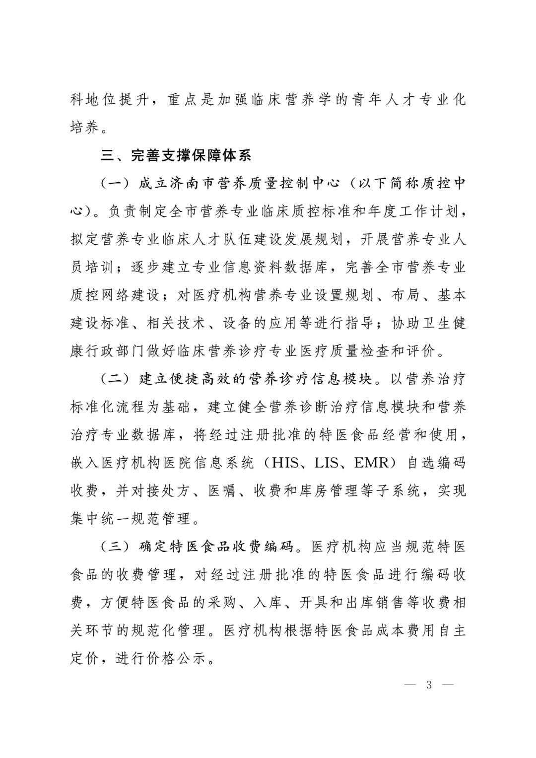 11111二级以上医疗机构要将营养诊疗科纳入临床一级科室。12111明确肠内营养剂由营养科统一管理,作为医院二级库房使用。13111明确医疗机构要设立专门机构实施特医食品规范化管理。14111明确要求医疗机构应当规范特医食品的收费管理,由医疗机构根据特医食品成本费用自主定价,并进行价格公示。15111鼓励医疗机构对临床营养诊疗和经过注册批准的特医食品自行编码,纳入院内信息系统在门诊收费,不计入医保费用。16111加强临床营养科规范化建设和管理。从营养筛查及评价、诊断、治疗、监测等方面,加强特医食品的基本应用要求以及处方行为,临床营养工作向改善临床营养指标、关注实施率、营养干预率和筛查率等方面延伸。17111要求以营养治疗标准化流程为基础,建立健全营养诊断治疗信息模块和营养治疗专业数据库,并规范特医食品信息管理,对特医食品的处方、审核、配制、配送、统计、监测、不良事件登记和退出等进行全流程管理,同时做好电子化存档记录,实现集中统一规范管理。18111卫生健康部门要加强市临床营养诊疗质控中心的管理。督促医疗机构营养科规范化建设,医疗机构做好特医食品的调配、临床应用和肠内营养配制室的设置与卫生规范。推动二级以上公立医疗机构临床营养诊疗科纳入临床一级科室管理,合理配备临床营养医师。19111从2021年开始,将临床营养诊疗工作纳入公立医院绩效评价体系,考核结果与医务人员岗位聘用、职称评聘、薪酬待遇等挂钩。感谢山东省尤其是济南市临床营养同仁们的努力!此文件的正面示范效应,将对临床营养和特医产业的发展起到巨大的、积极的推动作用。