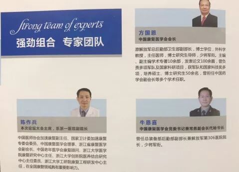 大会邀请到中国康复医学会会长、原解放军总后勤部卫生部副部长方国恩少将莅临致辞。本次论坛大会主席陈作兵教授,系浙一医院副院长、中国医师协会加速康复副主任、国家卫计委加速康复专委会委员、中国康复医学会理事、浙江康复医学会副会长、中国老年医学会康复顾问、浙江大学医学院康复研究中心主任、浙江大学创新院医养结合研究中心主任委员、浙江大学工研院康复工程研发中心主任,在全国康复领域具有重要影响力。届时浙江省卫计委、浙江省残联、杭州市民政相关部门领导、专家到会致词并对浙江省的康复政策进行解读。上海华山医院吴毅教授等国内知名康复专家莅临授课。